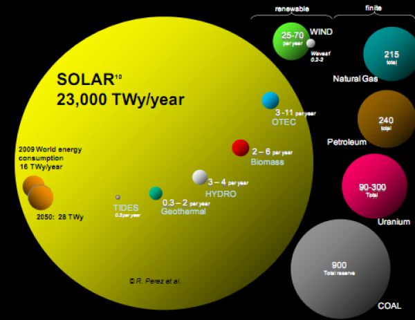 En el largo plazo , la economía están del lado de solar, porque es con mucho la fuente más abundante de energía disponible para nosotros. Los combustibles fósiles y combustibles fisionables son inherentemente limitadas , porque sólo hay una cantidad finita almacenado en la corteza terrestre . Como este diagrama demuestra ( en terrawatt -año por año ), la disponibilidad de la energía solar en la Tierra eclipsa otras fuentes de energía.
